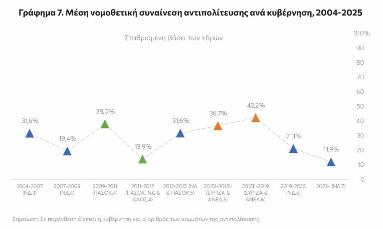 Στο χαμηλότερο επίπεδο από το 2004 η νομοθετική συναίνεση της αντιπολίτευσης στη Βουλή – Ενισχυμένη η πόλωση την περίοδο 2023–2025