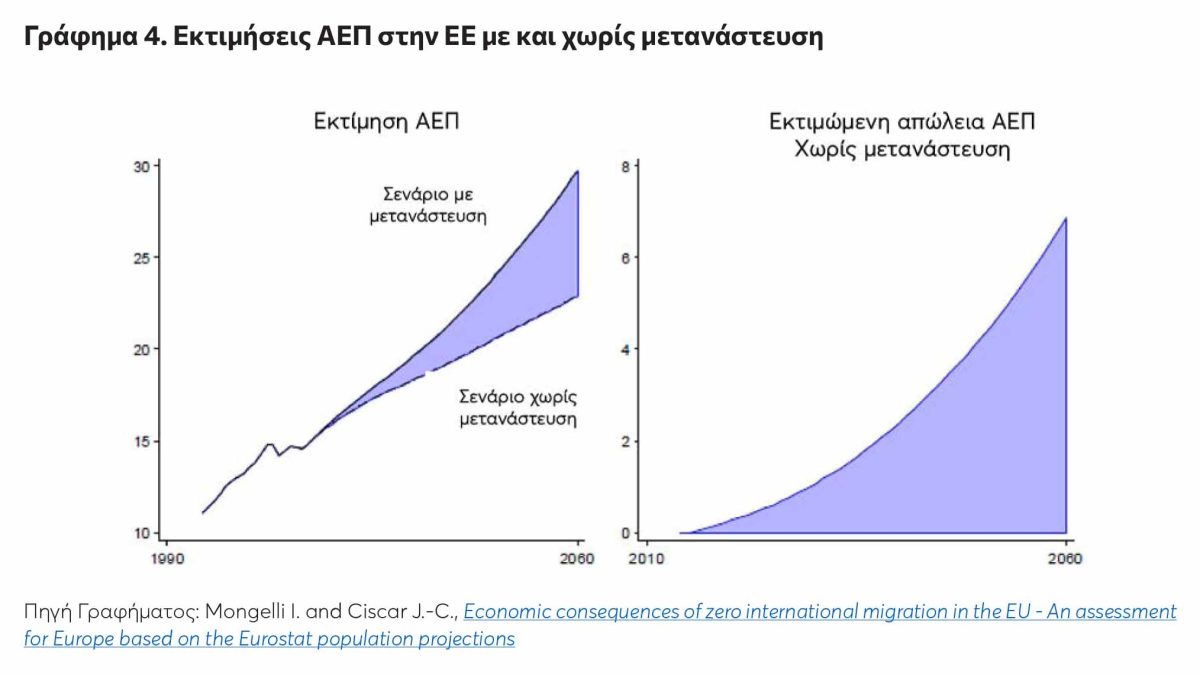 - Σε ό,τι αφορά τα μακροπρόθεσμα αποτελέσματα, η απουσία μεταναστευτικών ροών θα είχε σοβαρές επιπτώσεις στην ανάπτυξη, την απασχόληση και τη δημοσιονομική βιωσιμότητα της Ευρώπης. Χαρακτηριστικά, σύμφωνα με στοιχεία της Ευρωπαϊκής Επιτροπής, χωρίς μετανάστευση ο ευρωπαϊκός ενεργός πληθυσμός θα μειωνόταν έως και κατά 29% έως το 2060 (έναντι μείωσης κατά 11,9% με μετανάστευση), οι ρυθμοί ανάπτυξης θα περιορίζονταν σε επίπεδα κάτω του 1% ετησίως και η απώλεια παραγωγής θα έφτανε τα 47 τρισεκατομμύρια δολάρια.