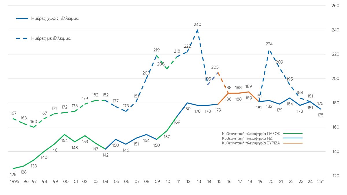 - Από το 2019 μέχρι και τις φετινές προβλέψεις για το 2025, η φορολογική επιβάρυνση έχει μειωθεί κατά 6 ημέρες, από τις 181 στις 175 ημέρες.