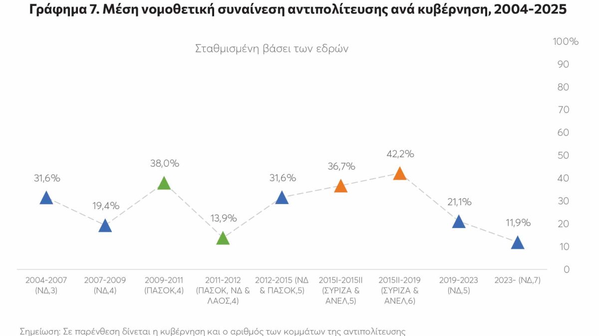 Στο χαμηλότερο επίπεδο από το 2004 η νομοθετική συναίνεση της αντιπολίτευσης στη Βουλή – Ενισχυμένη η πόλωση την περίοδο 2023–2025