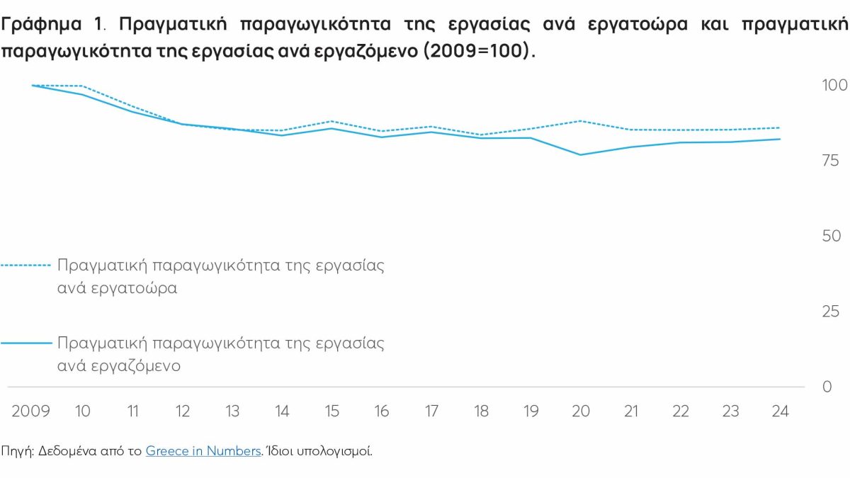 - Η παραγωγικότητα ανά εργαζόμενο βρίσκεται ακόμη χαμηλότερα, 18% κάτω από τα επίπεδα του 2009.